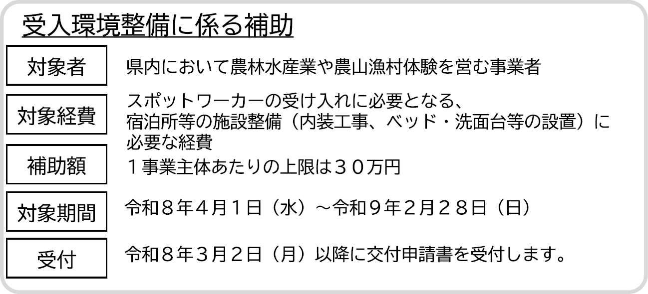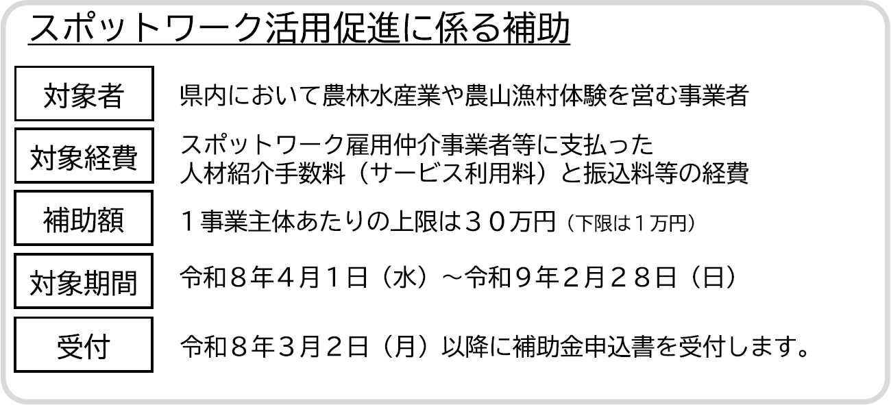 その一環として、「農山漁村スポットワーク推進事業」により、農林水産業者や農山漁村体験事業者の皆様を対象とし、スポットワーク活用にかかる手数料とスポットワーカー受入環境整備費用を支援します。