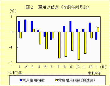 3 雇用の動き(事業所規模5人以上)「常用雇用指数」は、対前年同月比0.5%減の104.3「常用雇用指数」は104.3で対前年同月比0.5%減でした。このうち、「製造業の常用雇用指数」は96.8で対前年同月比0.3%増でした。