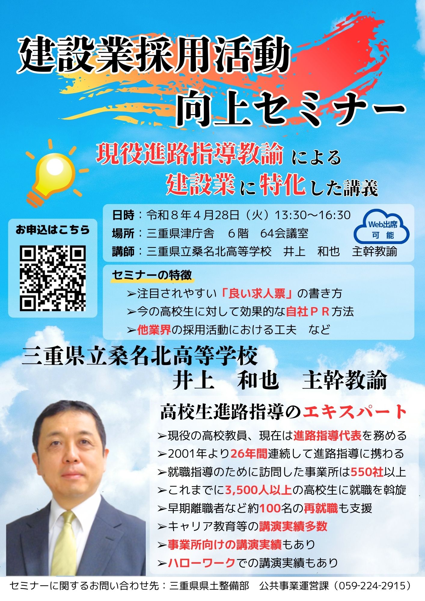 三重県建設産業活性化プラン2024に基づく取組の一環として、建設企業がより効果的に採用活動を実施できるようにすることを目的に、セミナーを開催予定です。