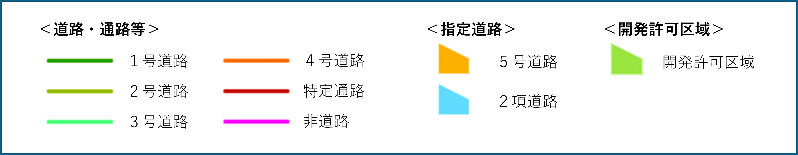- 本図は、随時更新を行っていますが、内容が変更になっている場合があります。道路として表示された路線でも現に存在しないなど、指定時と状況が変わり指定の要件を満たさないものは、法上の道路として扱うことはできません。最新の情報については所管建設事務所にご確認ください。