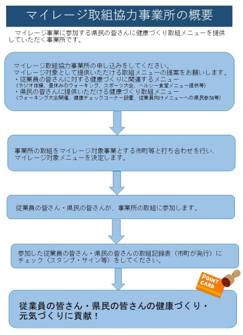 マイレージ対象となる従業員の皆さんや、県民の皆さんに対する健康づくり取組メニューを提供していただく事業所を募集しています。マイレージ事業実施市町に所在地がある事業所が対象になります。