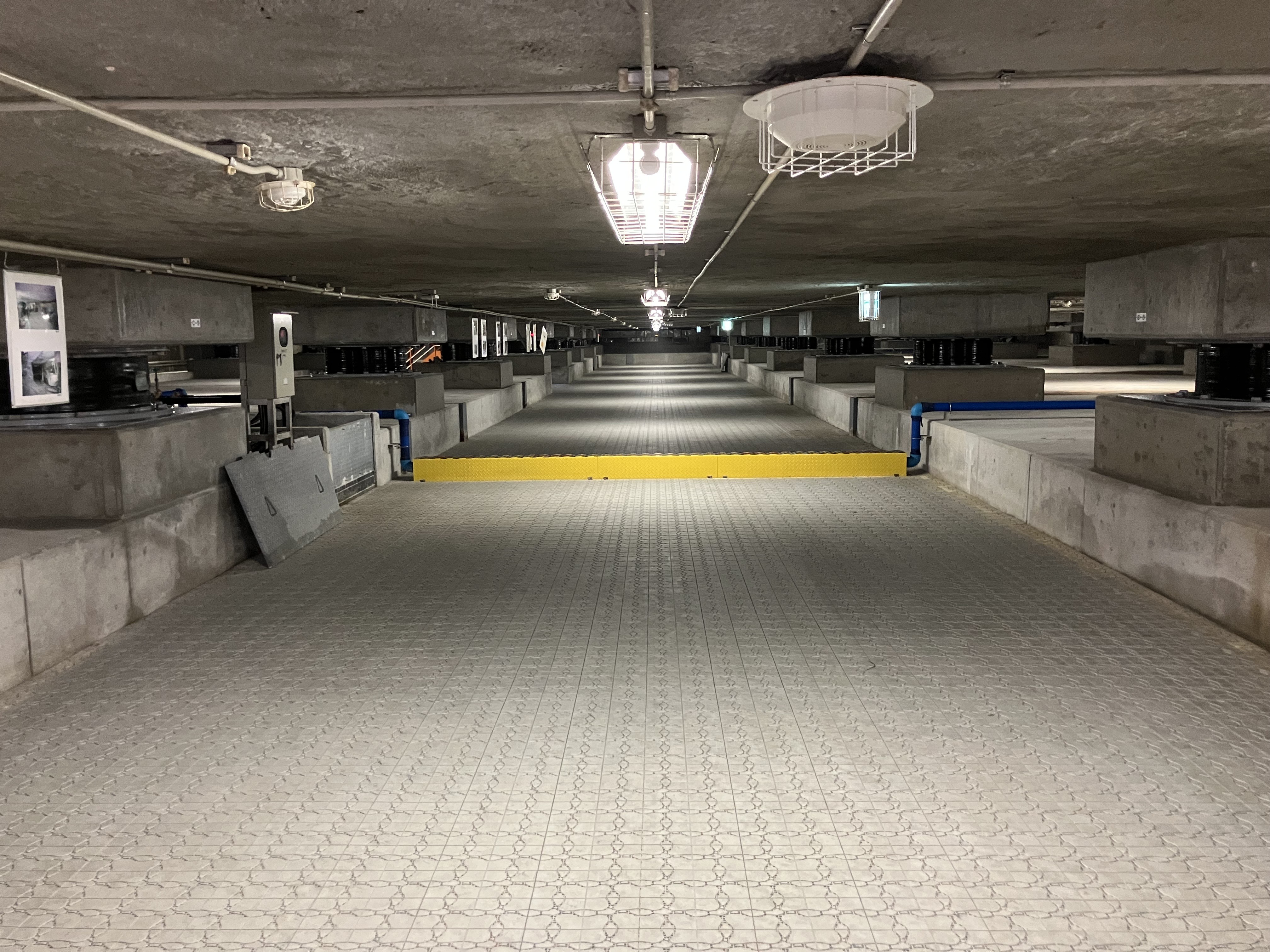 県庁屋上(伊勢湾・津市周辺の街並み 東・西・南・北)屋上から見える市内の景色についてご説明をします。 免震装置免震装置は、建物の固有周期を長くし、地震時の強い短い周期での動きを免れる働きをします。地震力を減衰し、ゆっくりとした揺れに変換して県庁の建物を守る仕組みを説明をします。 |