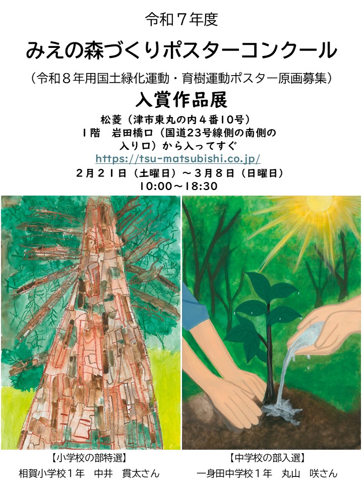 この度、松菱において、「令和7年度みえの森づくりポスターコンクール」の入賞作品17点を展示します。展示の概要