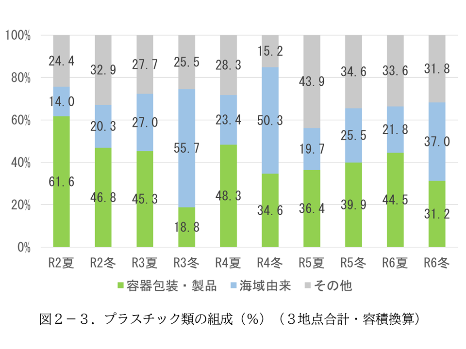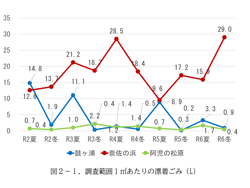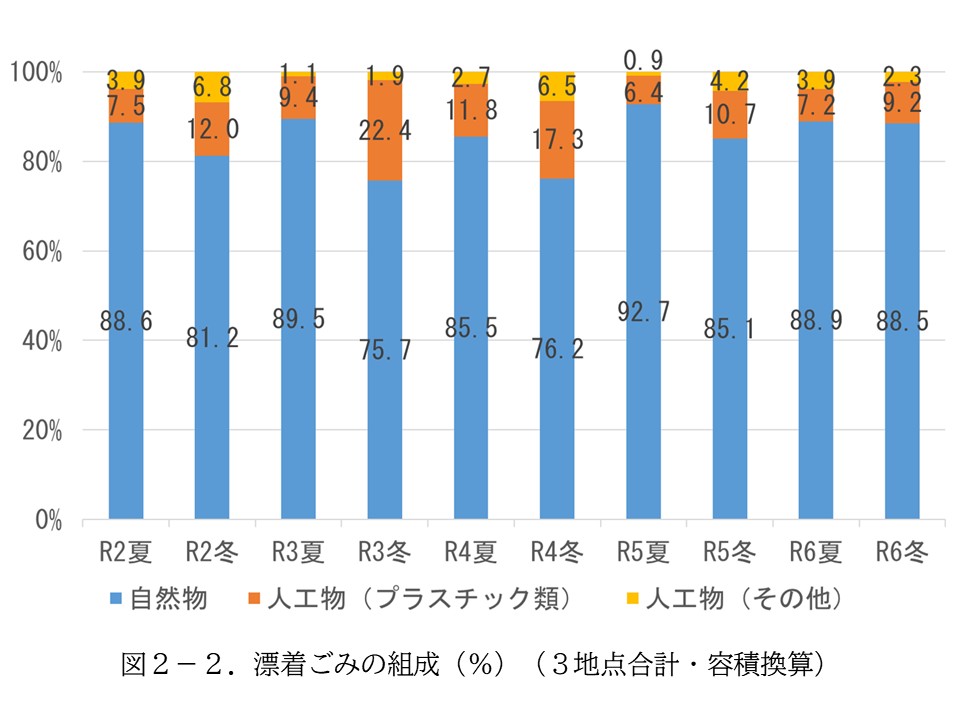 漂着ごみのモニタリング調査は、環境省が策定した「漂着ごみ組成調査ガイドライン」に基づき実施しています。・調査時期:夏季(6月~9月頃)・冬季(11月~1月頃)の年2回