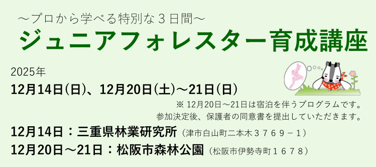 その取組の一環として小学4年生から中学3年生を対象に、森林・林業・木材産業へのより深い学びとさらなる関心を持つきっかけにしてもらうため「ジュニアフォレスター育成講座」を開催します。