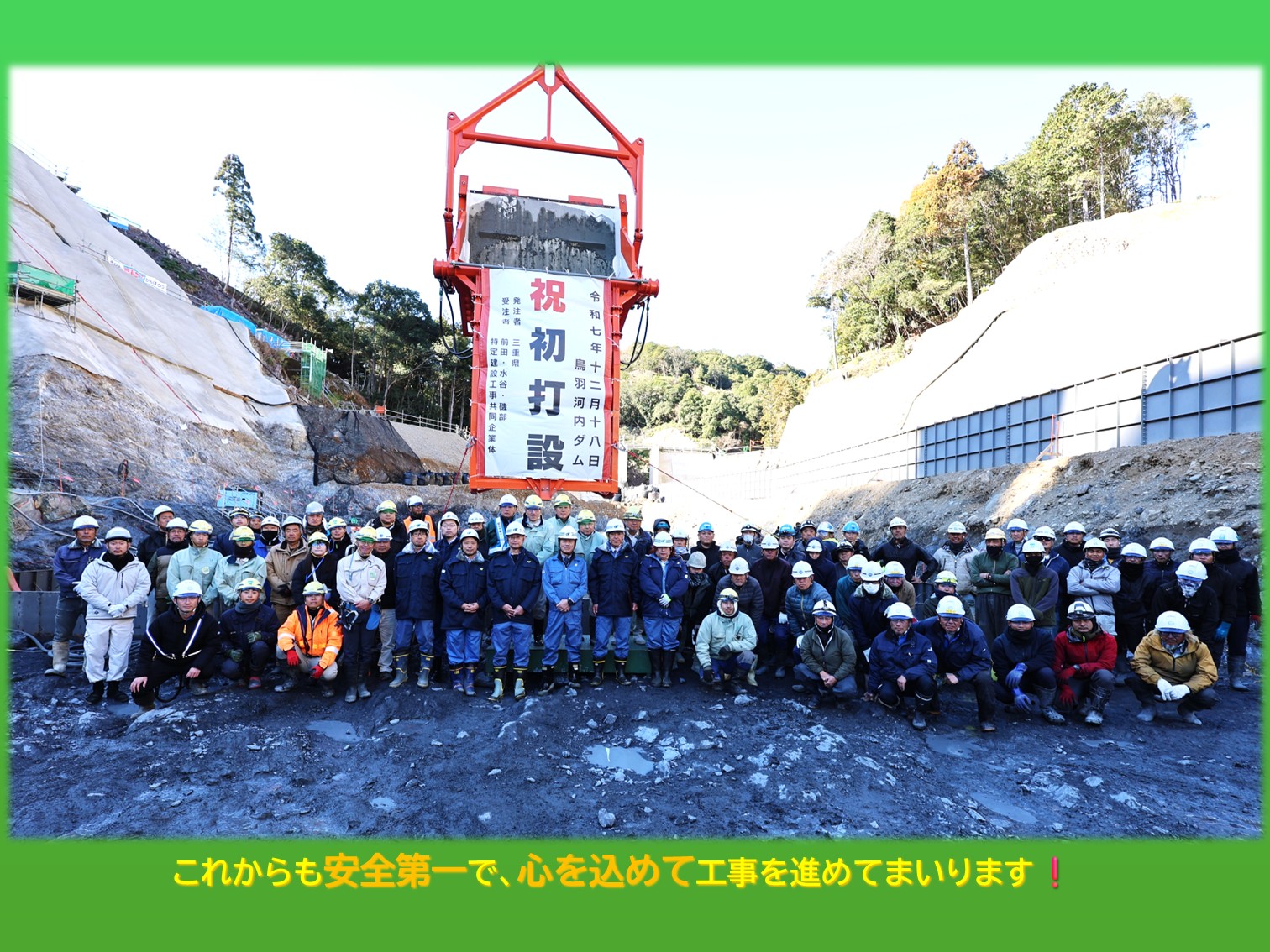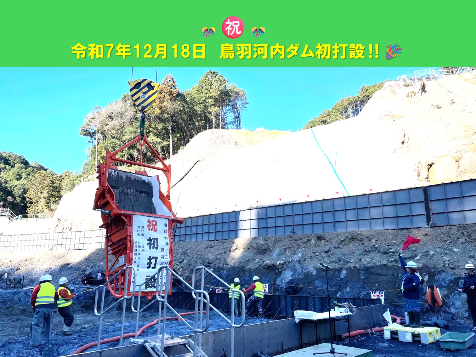 令和7年12月18日(木)、鳥羽河内ダム建設工事において、「コンクリート初打設式」が前田・水谷・磯部特定建設工事共同企業体の主催により執り行われました。
