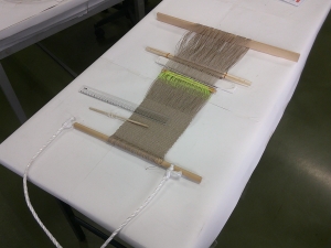 今回は、簡単な道具(原始機)を用いた布づくりに挑戦するとともに、県内の遺跡出土品など