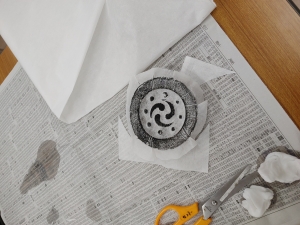 講座では、前半に古代から近世にかけての瓦の歴史や、作り方、文様の特徴について解説を行い、後半に遺跡から出土した瓦を使って、文様を墨を使って写し取る拓本体験を行いました。