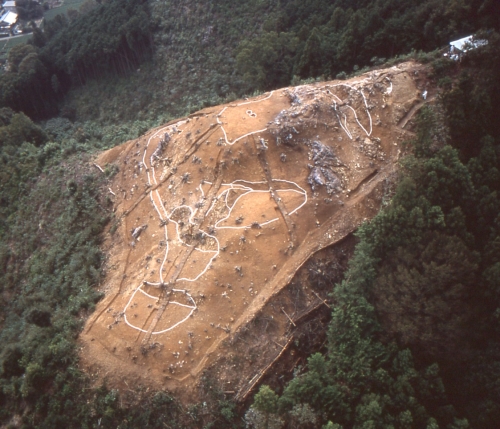 城は、最高所にある主郭と、5箇所程度の小規模な曲輪で構成されています。主郭は隅丸長方形を呈し、90㎡ほどの広さがあります。西側に延びる尾根を深い堀切で断ち切って造られており、北辺・西辺の一部には土塁が設けられています。また、主郭内では各所で火を焚いた跡がみられ、内部が焼けた土坑(穴)もみつかっています。これらは、炊事や狼煙を上げた痕跡の可能性があります。