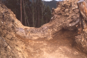 堀切の様子 土師器鍋の出土状況