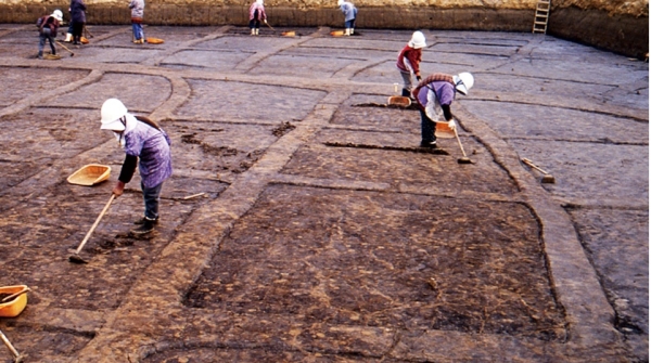 弥生時代には、三重県でも水田による稲作が始まります。写真は、津市森山東遺跡でみつかった、弥生時代後期のものとみられる水田の遺構です。