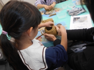 小学1年の児童は、初めての経験にもかかわらず、手際よく粘土紐を輪積みして土器を完成させました。そして、その出来栄えに大変満足していました。