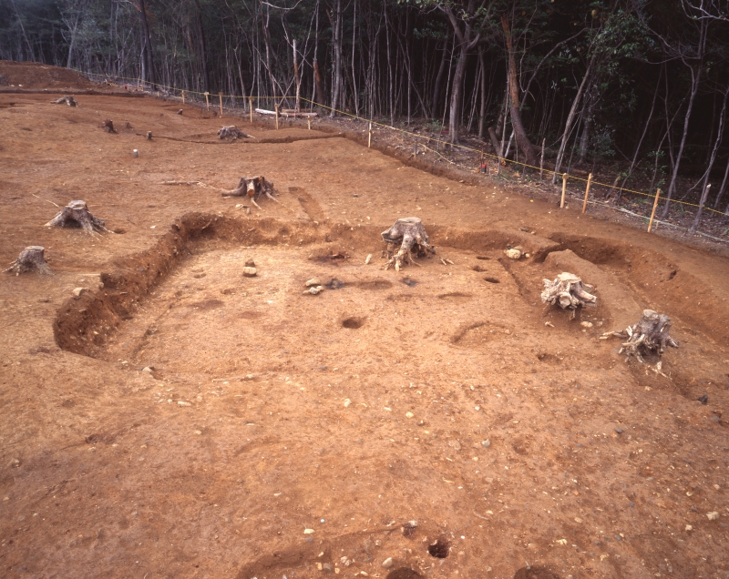 筆ヶ崎古墳群とともに発掘調査が行われ、多くの竪穴建物や掘立柱建物がみつかりましたが、これらの建物は筆ヶ崎古墳群の造営後、それほど時間を置かずに古墳の周りに建てられはじめたようです。古墳を造った集団と集落を営んだ集団との関係や、当時の人々の墓地に対する意識などが気になるところです。